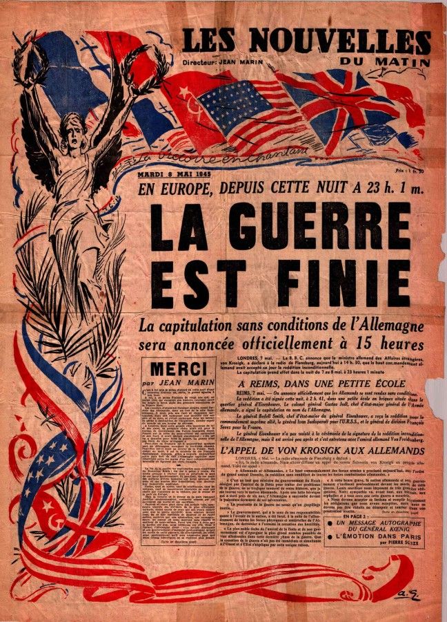 Les Unes du 8 mai 1945 Journaux du 8 mai 1945 Le 8 mai 1945, la Seconde Guerre Mondiale se terminait en Europe. Plus de 70 ans après, revivez ce mois de mai grâce à une collection de journaux de l'époque issus d'un dépôt numérique Fonds Spéculante . "La guerre est finie" Journal Les Nouvelles du Matin daté du 8 mai 1945 Fonds J. Speculante