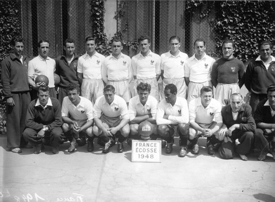 Cette photo nous montre l'Equipe de France de 1948 à laquelle appartient Emile Biongiorni (au centre, accroupi) qui affronte l'Ecosse lors d'un match amical.