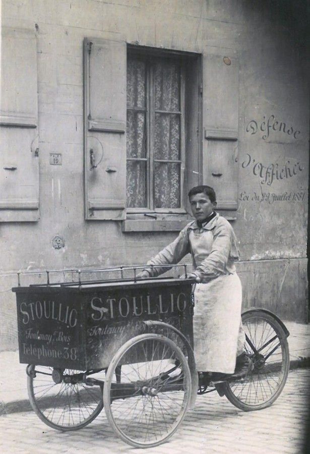 Sur la caisse de son triporteur est inscrit le nom de son employeur : la « maison Stoullig », commerce fontenaysien, situé 7 rue Notre-Dame.