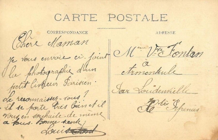 Louis Fontan est fier d’envoyer à sa mère, une photographie où il est en tenue de « petit livreur parisien ».