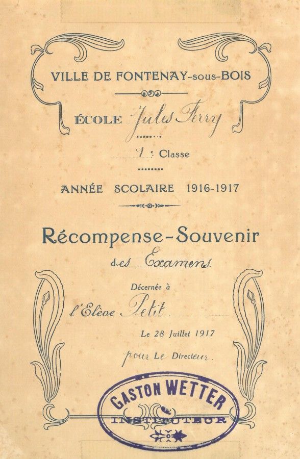 Le 28 juillet 1917, Henri Petit, élève à l’école publique de garçons « Jules-Ferry », finit une première année de primaire en beauté avec une récompense-souvenir.