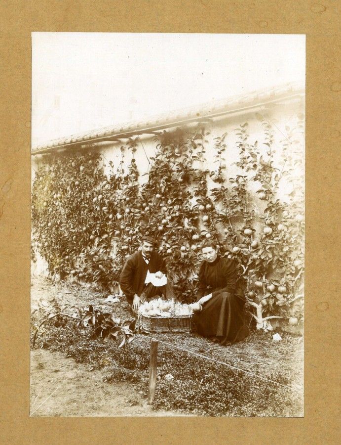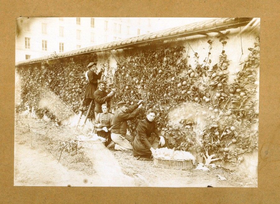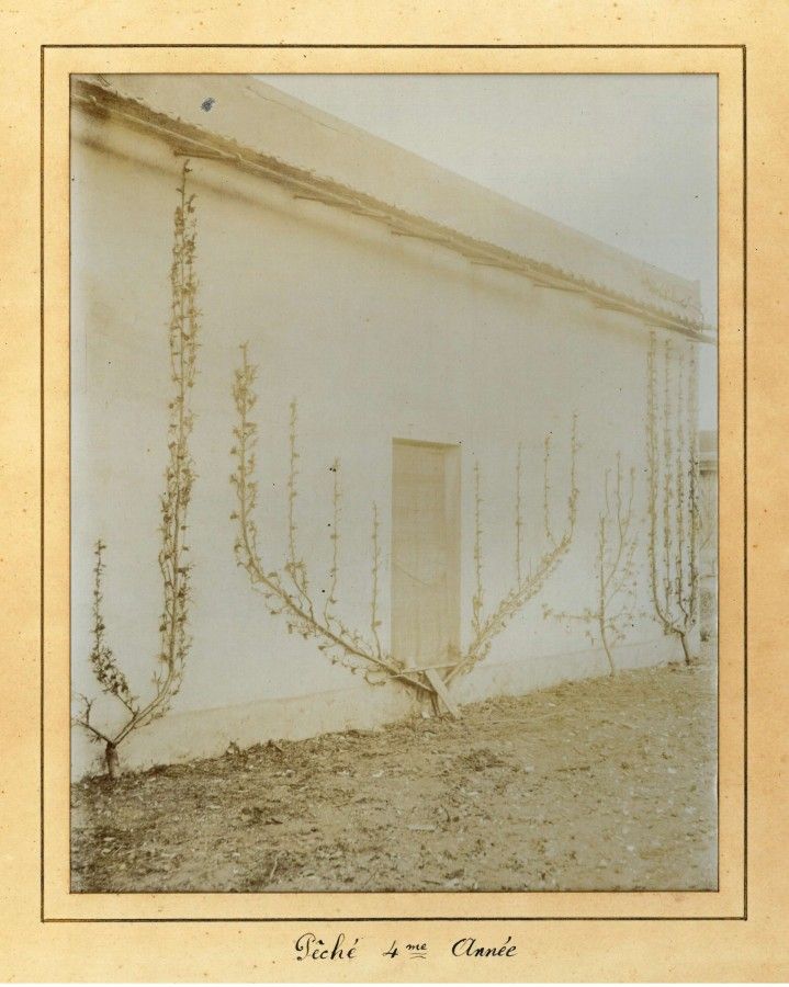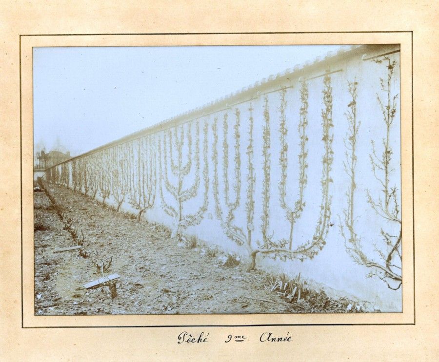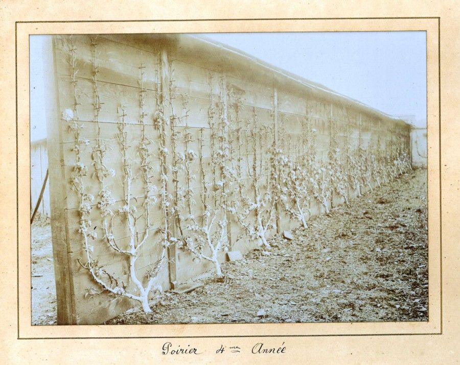 Les photos montrent des variétés de poiriers, pêchers et pommiers, plantés en espaliers et contre-espaliers. L'espalier est la forme verticale et plate de l'arbre obtenue grâce à une taille savante et qui pousse le long d'un mur. La plantation en contre-espalier n'a pas de mur tuteur.