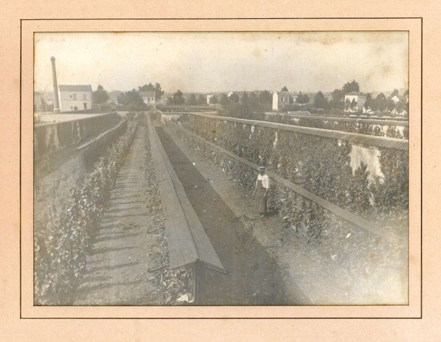 Cette vue permet d'observer le cloisonnement du paysage fontenaysien. Les murs d'enceinte sont en pierre et plâtre et plus hauts que les murs de refend, en bois. Des sachets en papier sont dispersés un peu partout. Dès 1880, ils étaient utilisés pour la technique de l'ensachage qui permettait de préserver les fruits des insectes et des maladies ainsi que des coups de soleil. Cette technique favorisait la maturation et rendait la chair plus fine.