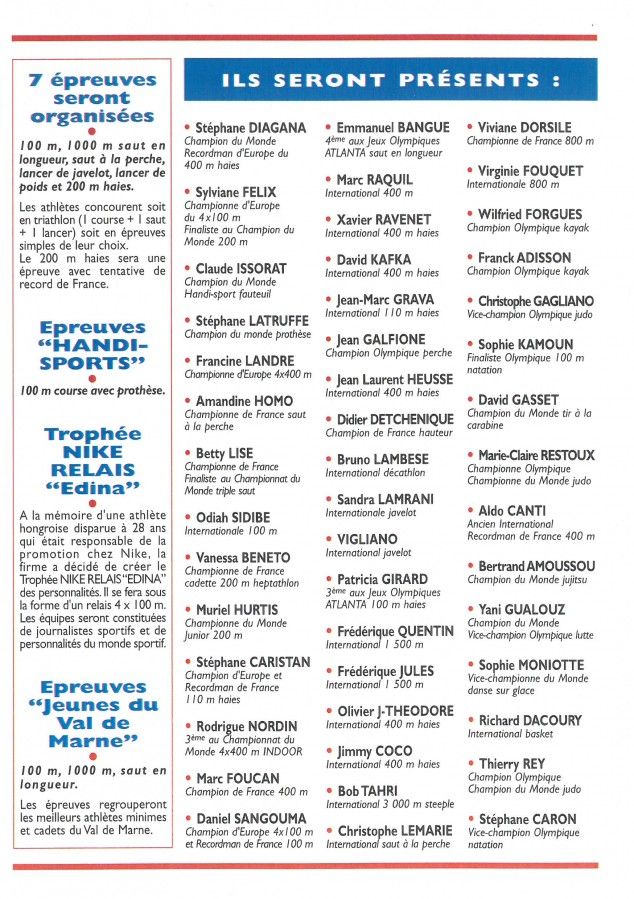 L'édition 1998, sujet du document du mois, est un triathlon par équipes (un homme - une femme), tirées au sort pour créer des surprises. Ces équipes doivent choisir entre deux épreuves dans les disciplines de lancer (javelot ou poids), de saut (hauteur ou longueur) et course (100 mètres ou 1000 mètres).