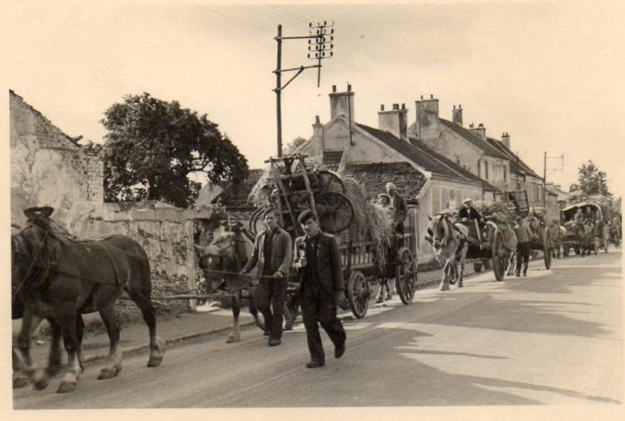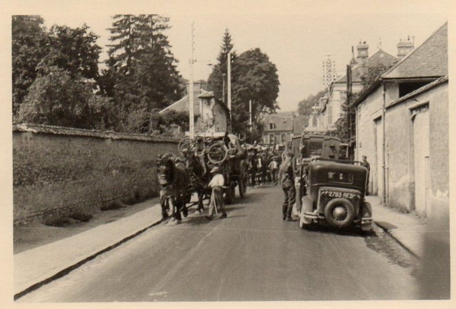 Nous avons parcouru les routes en voiture à cheval avec bâche, ce qui m’a permis de dormir souvent à l’intérieur sur les matelas que l’on avait emportés. A 9 ans, je n’avais pas la notion du danger sauf quand nous avons essuyé le bombardement d’Etampes. Je me souviens avoir vu des chevaux morts sur le bord de la route. Nous n’avons pu passer la Loire car le pont avait sauté et nous avons eu la fâcheuse surprise de voir arriver les Allemands. Ils nous ont fait mettre contre un mur de grange, nous avons pensé être fusillés. Des avions allaient et venaient au-dessus de nos têtes. Ne pouvant progresser sur les routes, nous avons alors rebroussé chemin et sommes revenus à Paris.