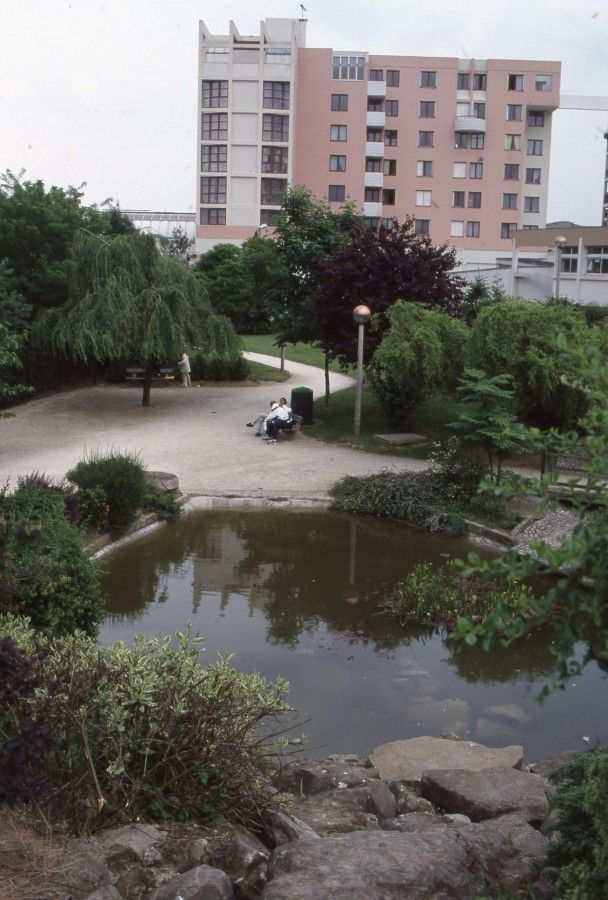 La présence très marquée de l'eau dans cet aménagement (mare, ruisseau, cascades) est sans doute un rappel à l'existence de zones marécageuses dans ce secteur avant la construction du grand ensemble.
