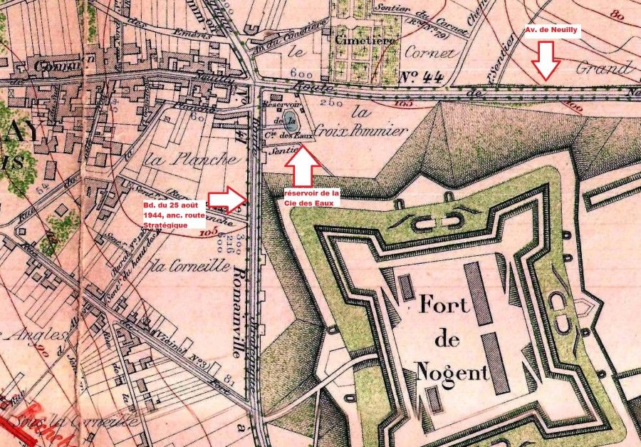 Le réservoir est construit à l'angle de l'avenue de Neuilly et de la route Stratégique (actuel boulevard du Vingt-cinq-août 1944), sur la ligne de crête de la butte de Belleville, où s'étend en partie le territoire de Fontenay.