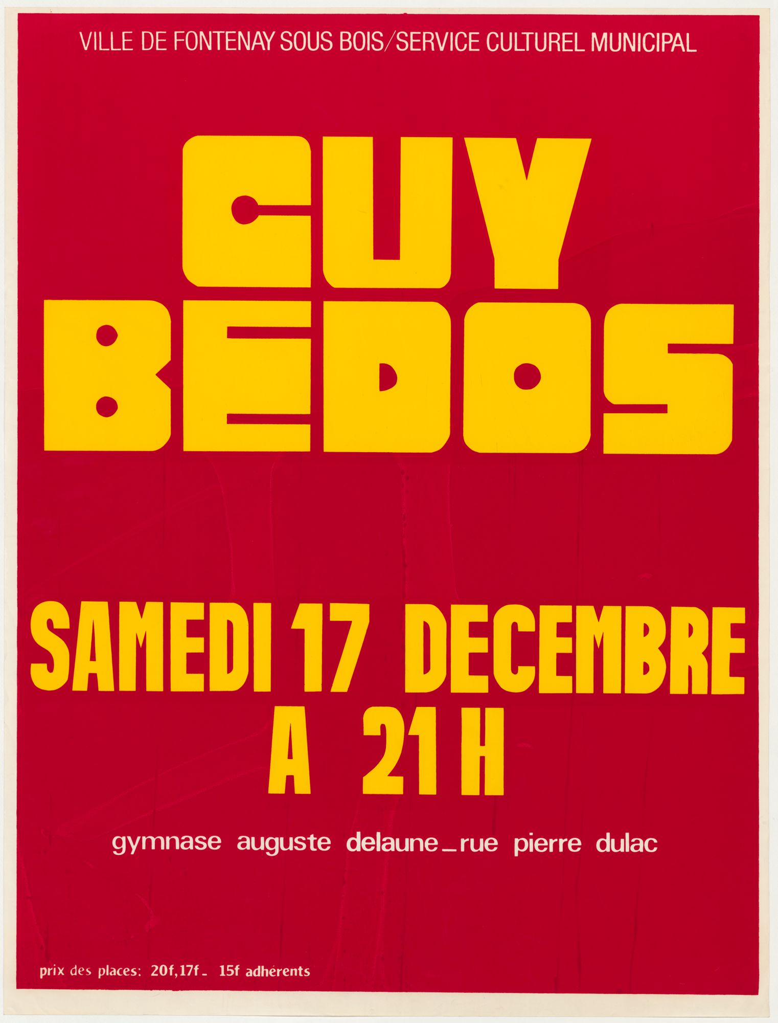 17 décembre Affiche du spectacle de Guy Bedos, 1977 Spectacle de Guy Bedos au Gymnase Auguste-Delaune Affiche de 1977 dimensions : 80 x 60 cm cote : 1 Fi 760