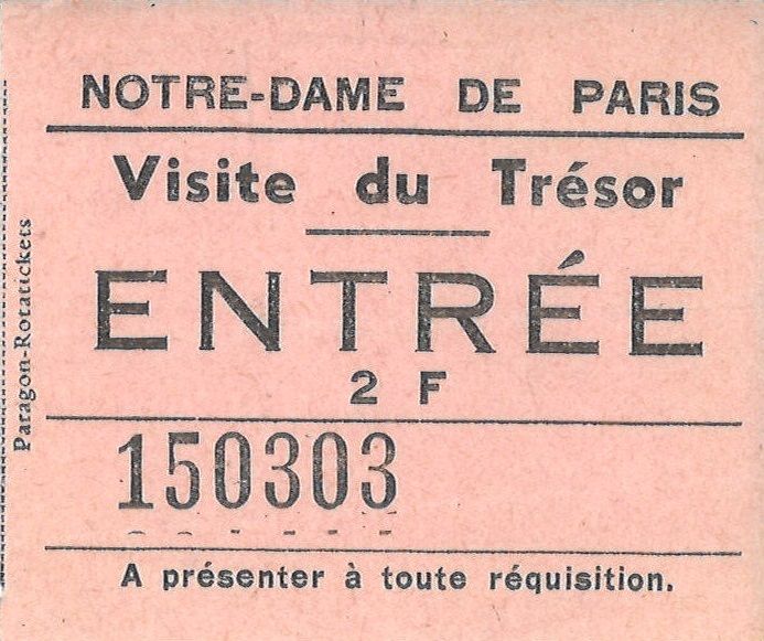 Pour la réouverture de la cathédrale Notre-Dame-de-Paris au public nous vous proposons ce ticket d'entrée issu du fonds communal pour la visite du Trésor .