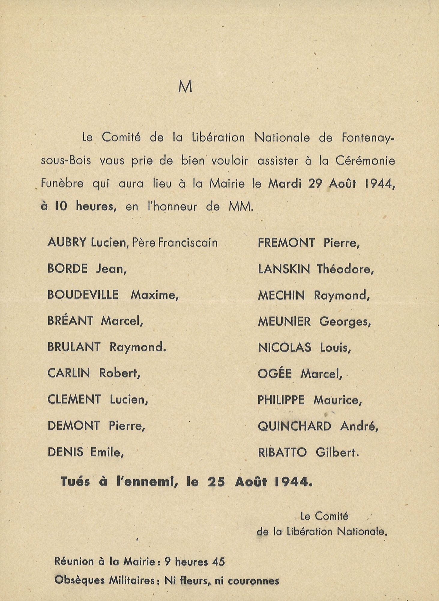 Le 25 août 1944, le contexte de tension liés aux combats au sein même de Fontenay se ressent par l’appel réalisé par les dirigeants de la commune et adressé aux parents par affiches pour que ces derniers évitent de laisser les enfants circuler librement dans les rues.