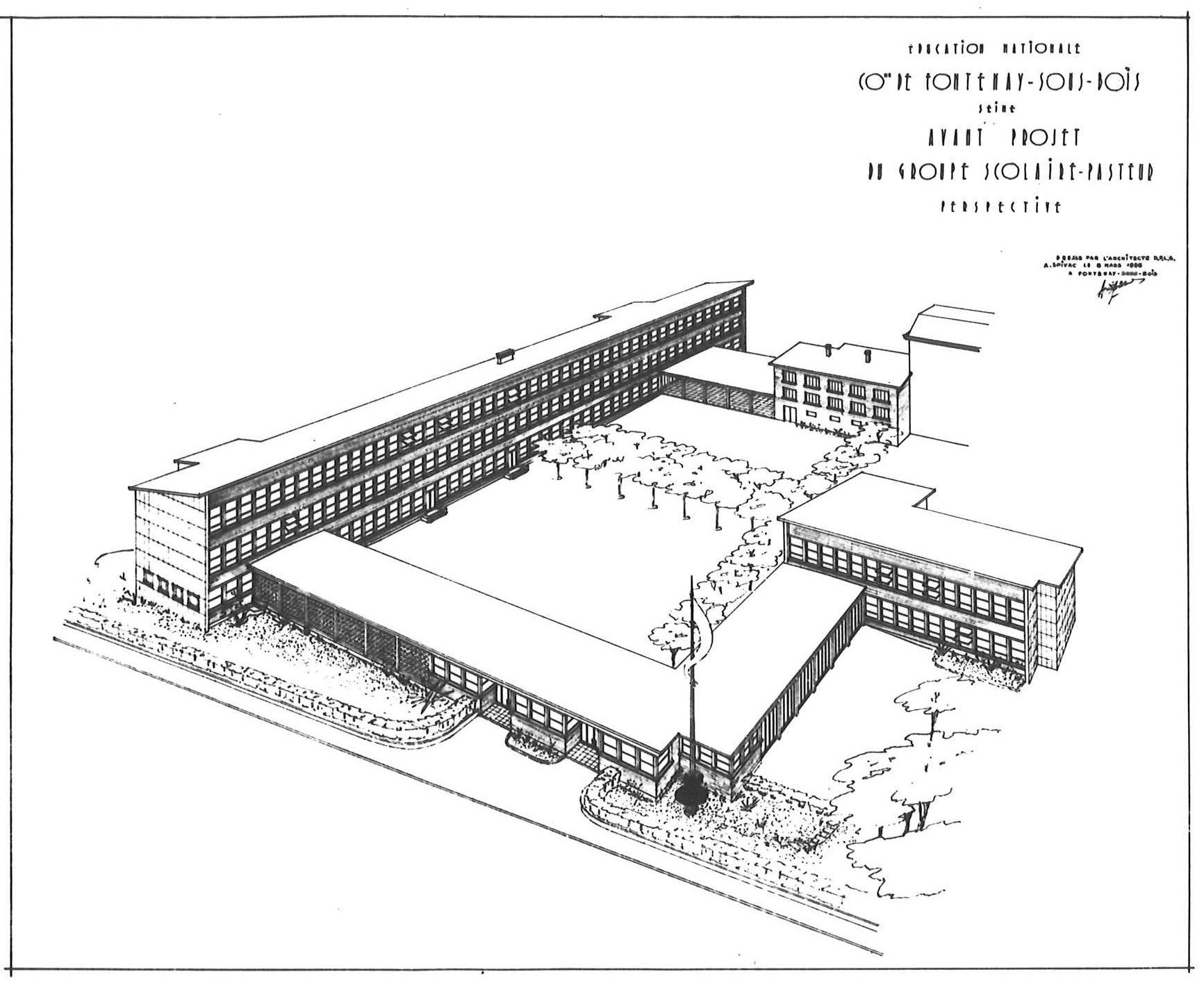 Le projet définitif de l' architecte, Alexandre Spivac, propose la construction d' un groupe scolaire de 8 classes de garçons, 10 classes de filles avec une salle d' enseignement ménager et 5 classes maternelles.