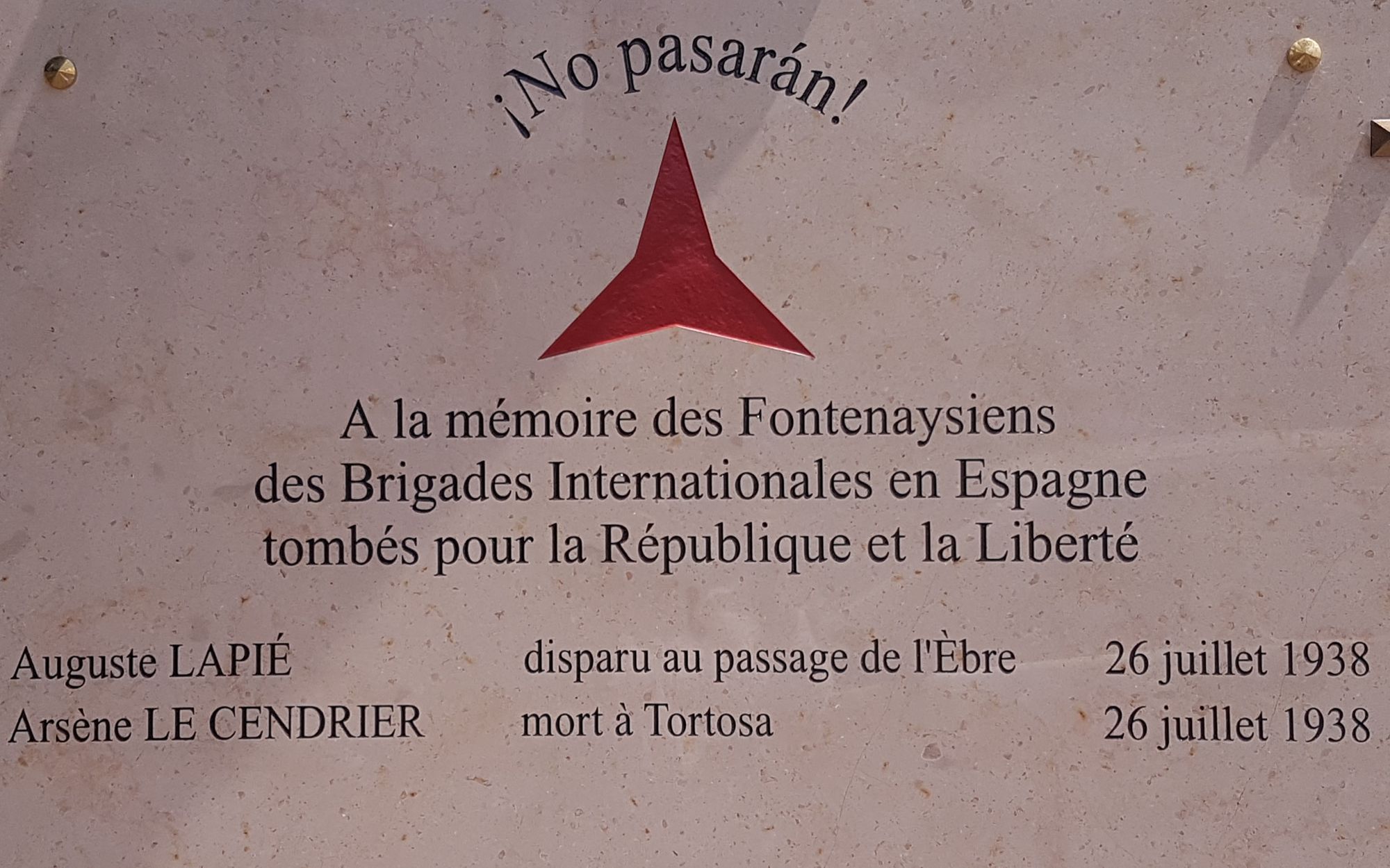 No Pasaran Mémoire aux Fontenaysiens des Brigades Internationales morts au combat pendant la Guerre d'Espagne, 1936-1939 Plaque posée le 8 mai 2021 Carrefour des Martyrs Mémorial de la Liberté