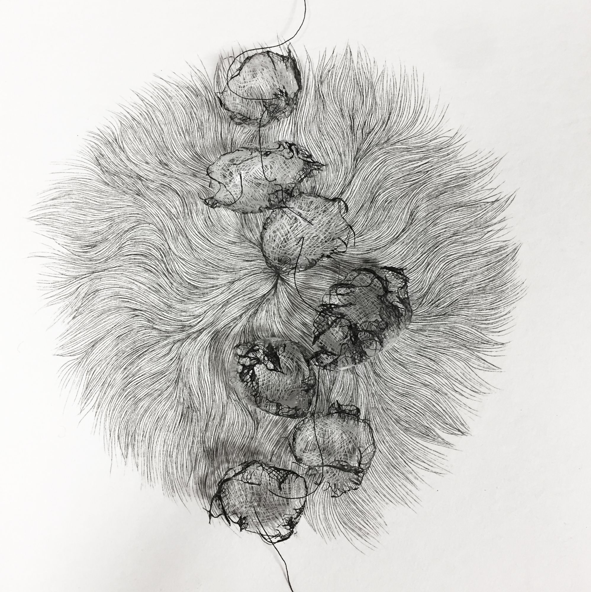 Tissu encré, moulé et collé, feutre et fils cousus sur papier aquarelle