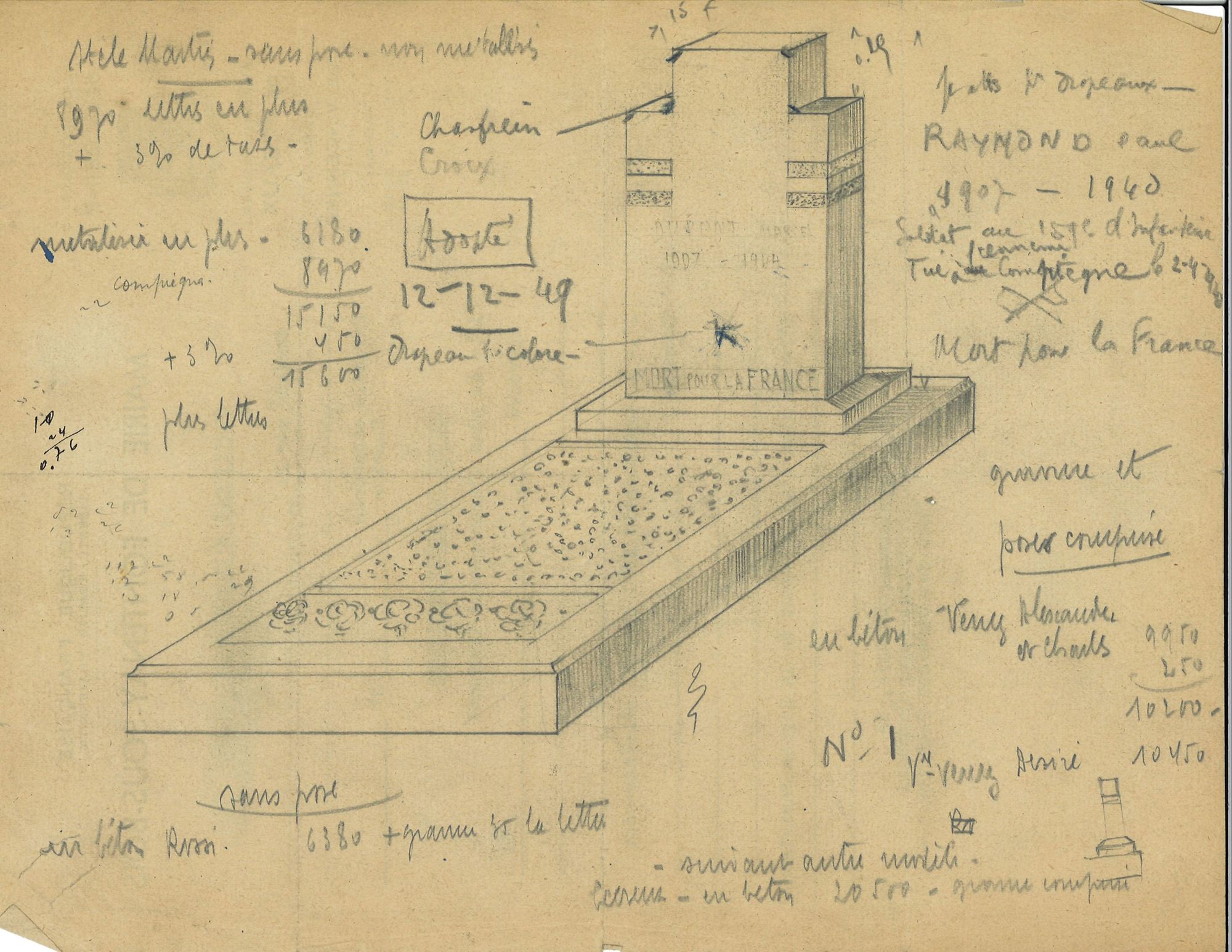 Croquis d'une tombe modèle, présenté par l'entreprise funéraire fontenaysienne, Verez Frères pour le marché de fourniture des tombes du cimetière militaire.