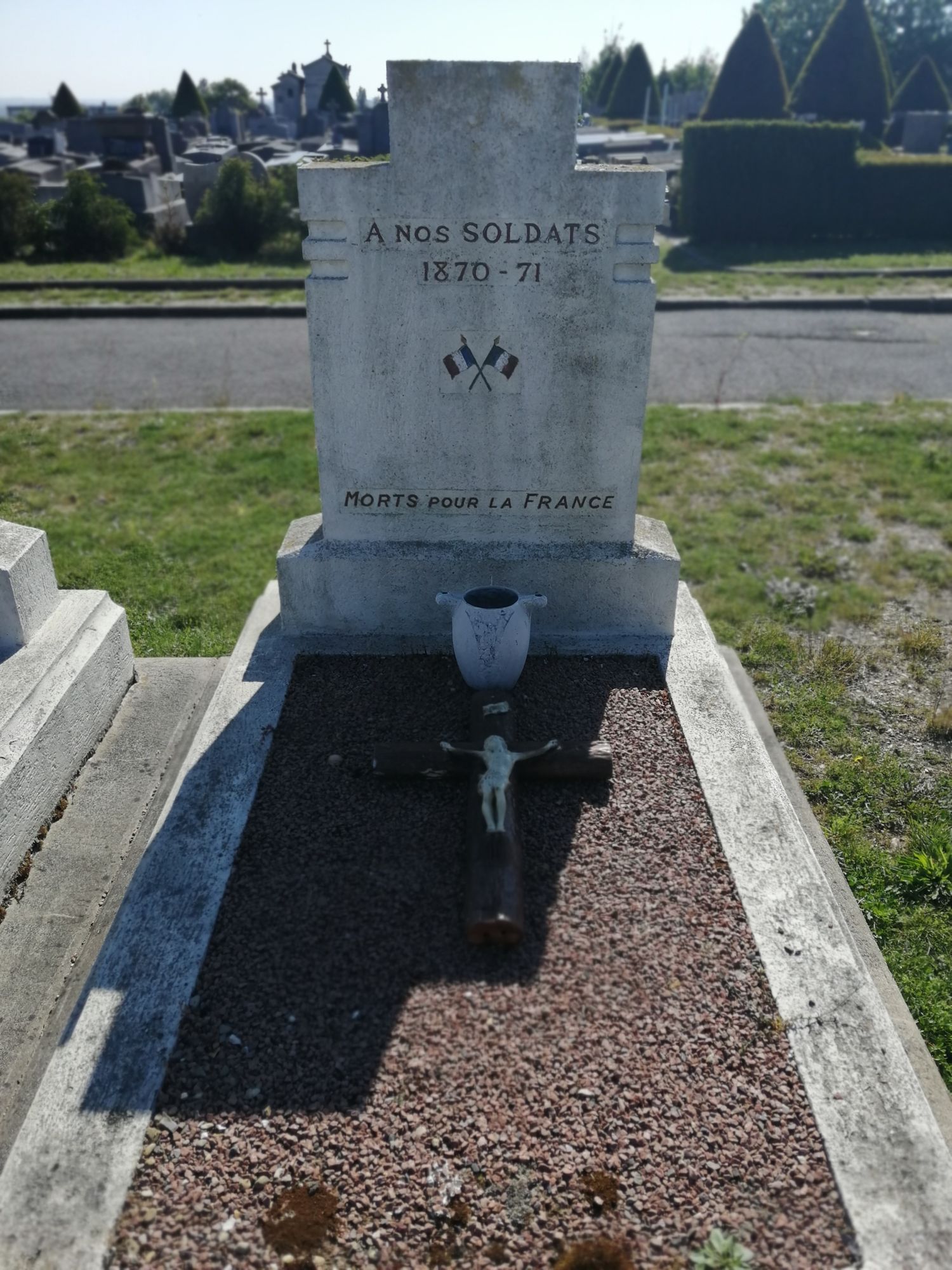 Une plaque émaillée posée sur la tombe et une autre réglementaire, en fonte, rappellent la loi de 1873 qui engage l'Etat français à la conservation des tombes des soldats morts pendant la guerre de 1870-1871.
