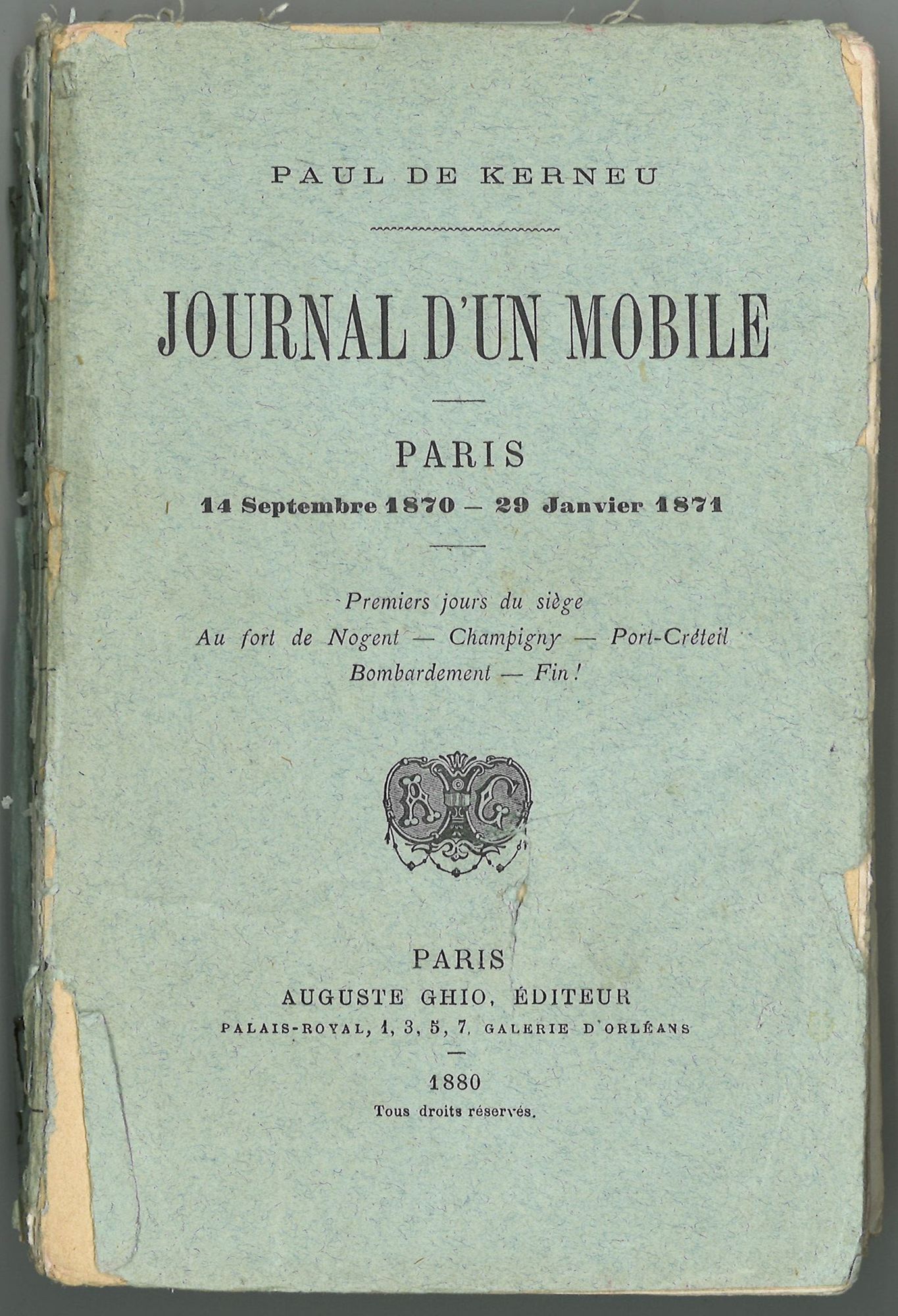 Première de couverture de l'ouvrage de Paul de Kerneu, 1880. Journal d'un mobile, Paris 14 septembre 1870 - 29 janvier 1871. Premiers jours du siège - Au fort de Nogent - Champigny - Port-Créteil - Bombardement -Fin ! Paris, Auguste Ghio éditeur, 239 pages.