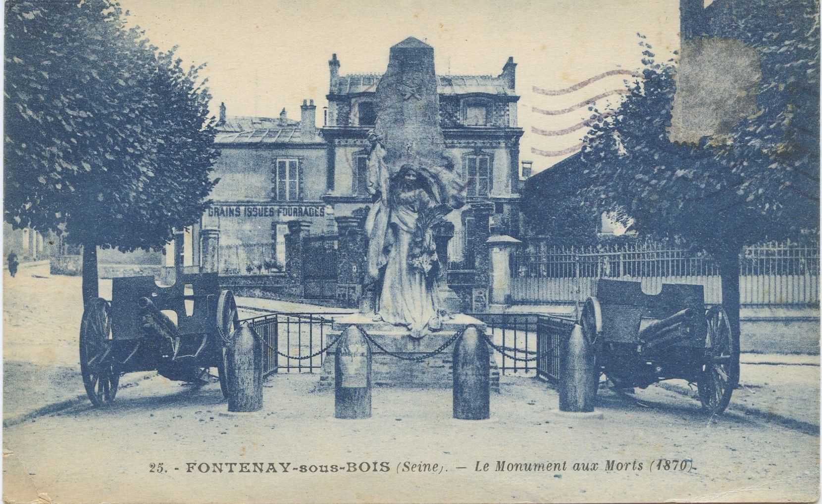 Carte postale du monument aux morts de 1870-1871, entouré de bornes de pierre en forme d'obus et de deux pièces d'artillerie, Bd des écoles.