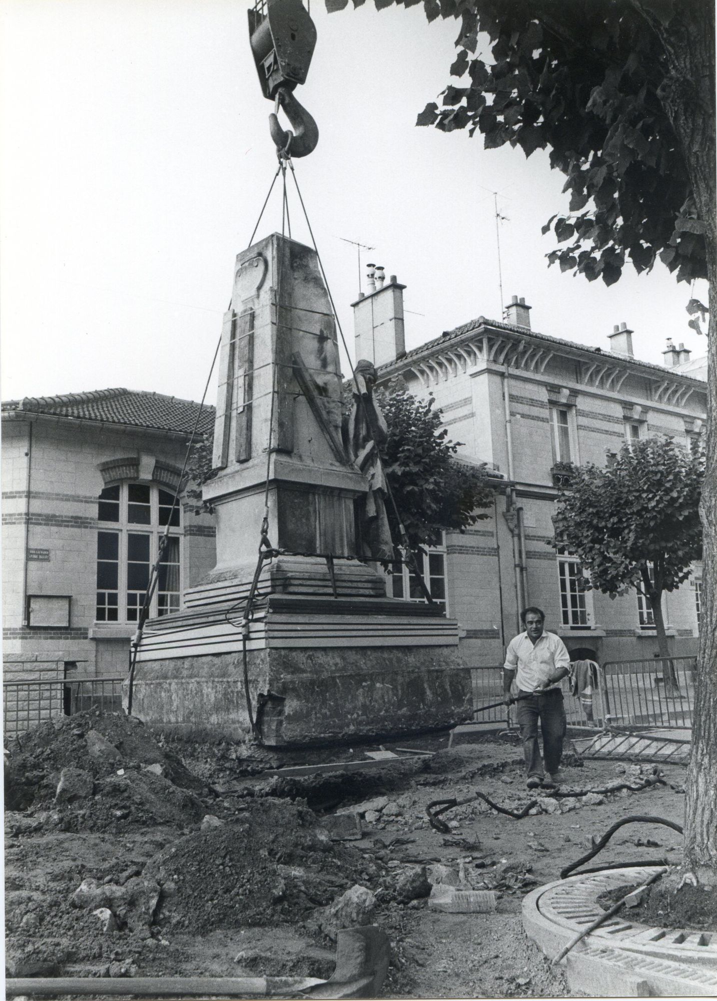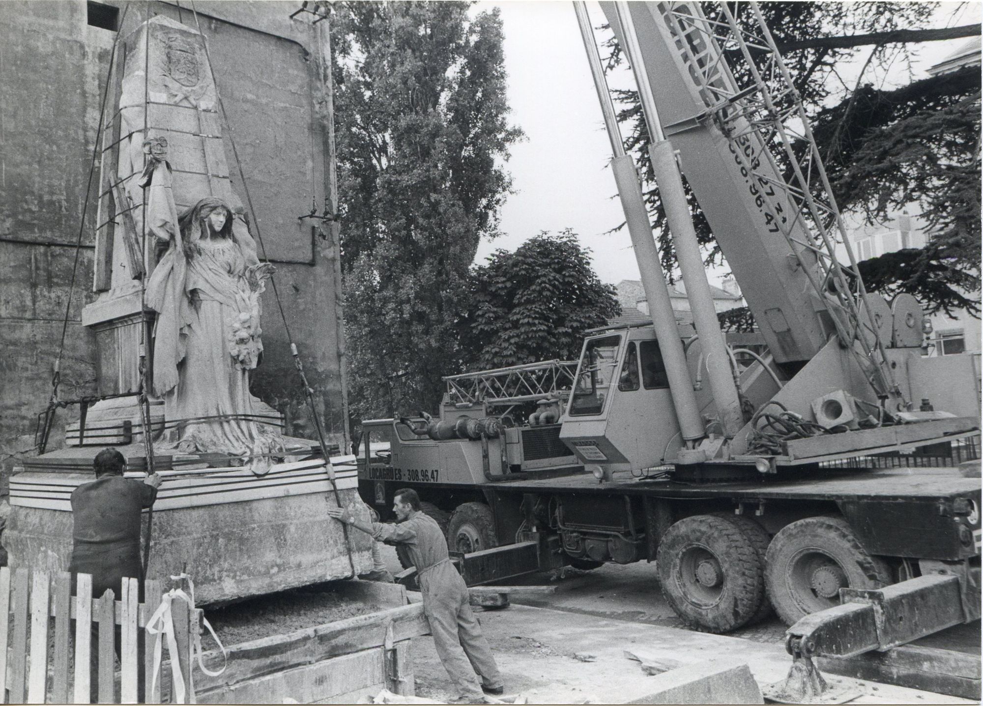 Photographie du déplacement du monument aux morts de 1870-1871, du Bd. André-Bassée à l'angle des rues de l'Ancienne mairie et François-Poil