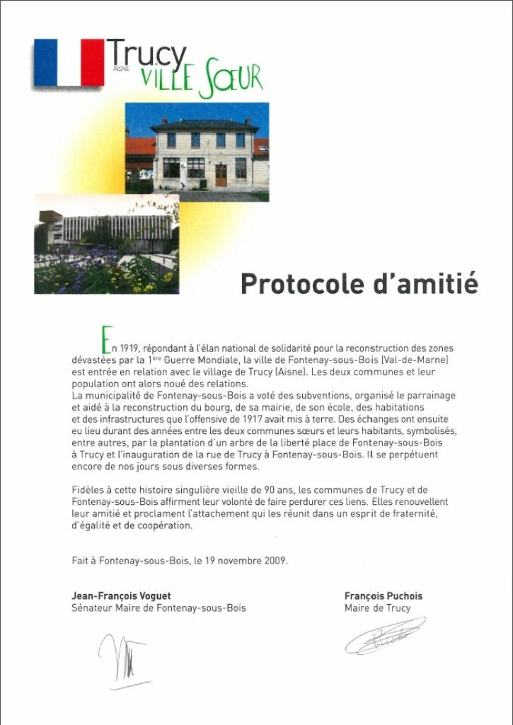 Depuis 1920 des échanges intergénérationnels, historiques, sportifs et culturels se perpétuent. Des délégations des deux communes se rencontrent régulièrement. Les maires de Fontenay, Jean-François Voguet, et de Trucy, François Puchois, ont signé en novembre 2009 un protocole d'amitié entre les deux communes rappelant cette histoire singulière.