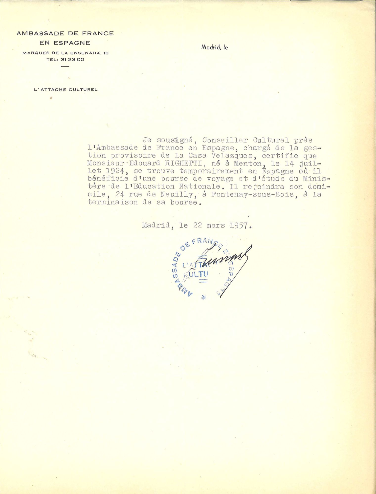 De 1956 à 1957, il devient pensionnaire à la Casa Velásquez, fruit de son travail à l'exposition 40 000 Ans d'Art moderne au Musée moderne de la ville de Paris.