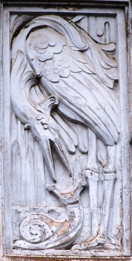Les animaux représentés sont la cigogne, le héron, le corbeau et le renard. Chaque bas-relief mesure 1m sur 2 m.