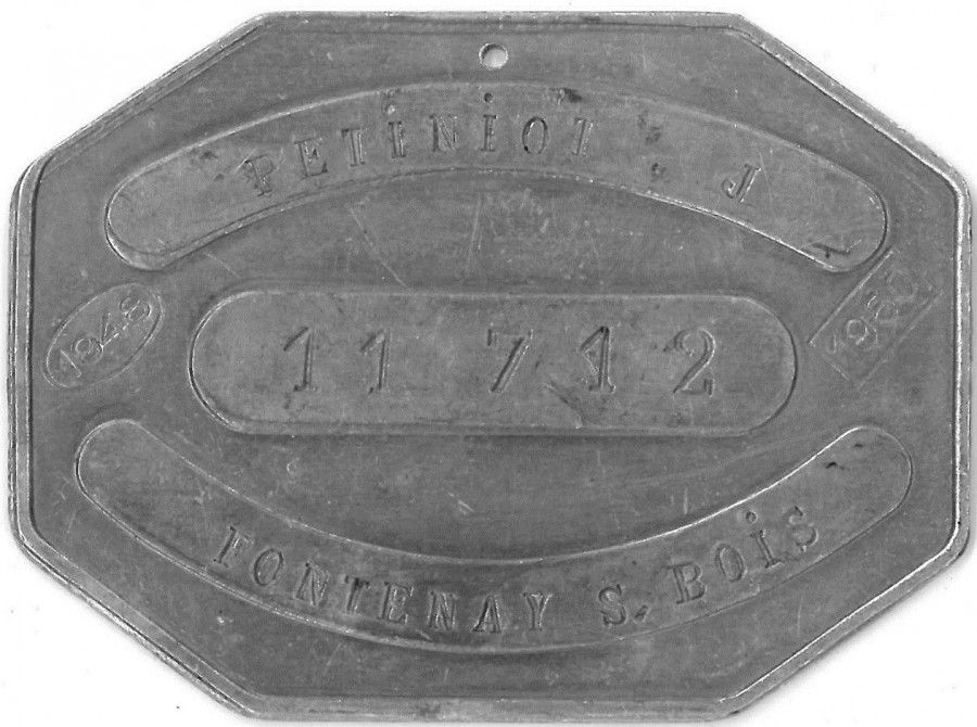 Plaque nominative Plaque, 1948-1950 Cette plaque retrouvée au sein d'un fonds privé porte les indications "PETINIOT J. 1948-1950 et le numéro 11 712". Elle mesure 8x5,5 cm Nous avons besoin de vous pour identifier son utilité.