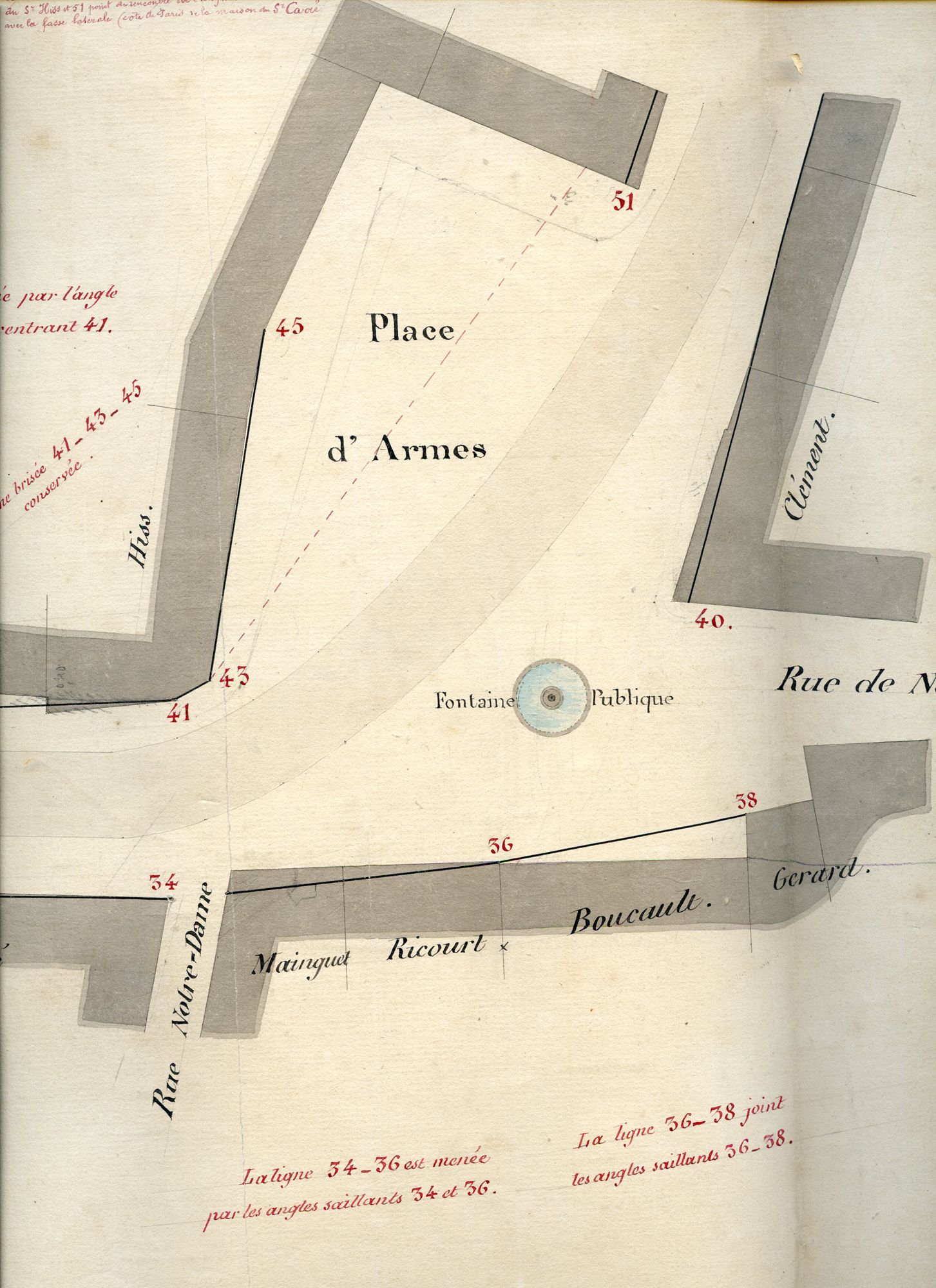 En 1838, la place d’Armes est pavée afin d’éviter les ornières formées lors des fortes pluies par l’eau dévalant depuis l’Église.