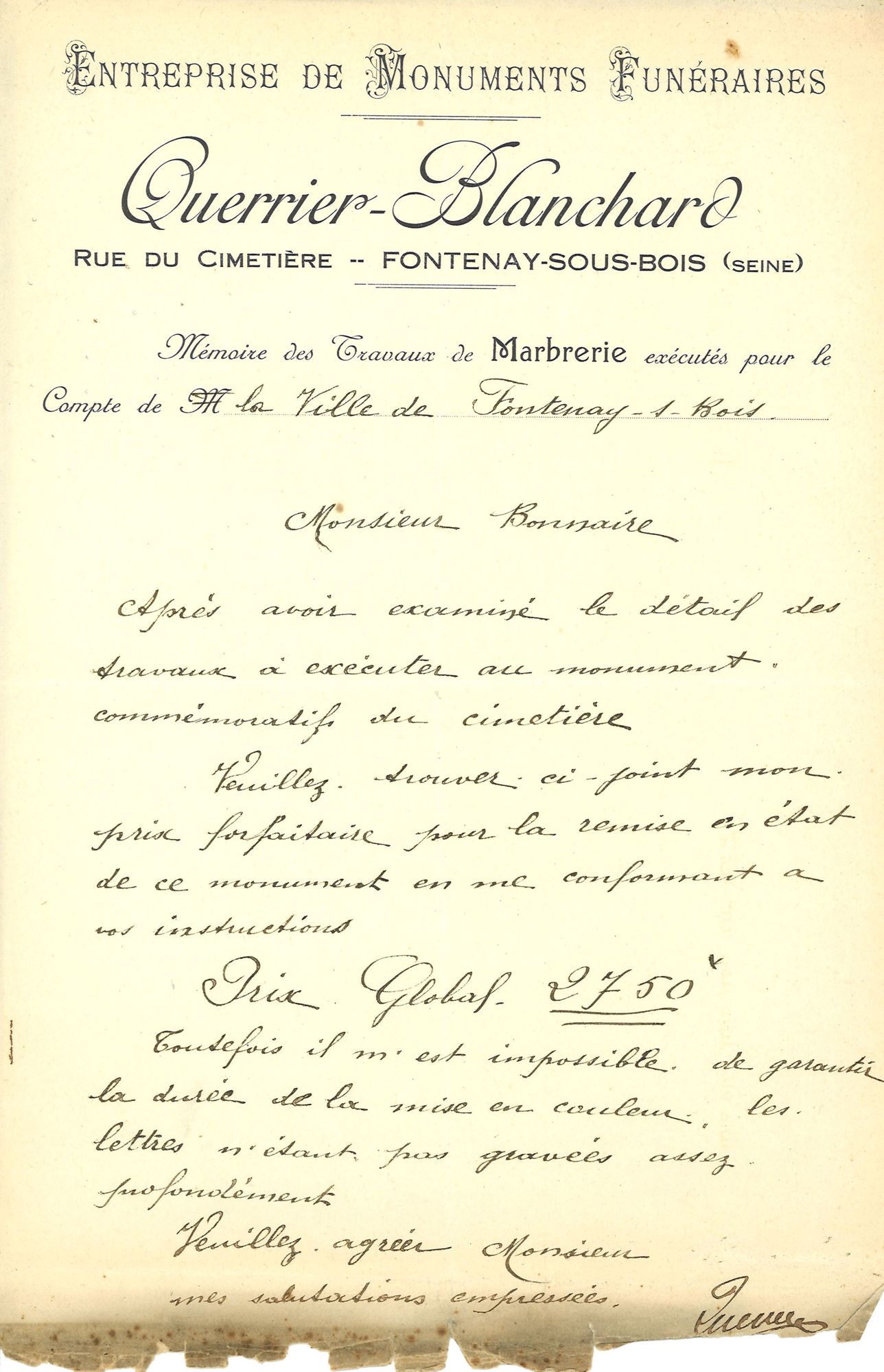 Enfin, le devis ne prévoyait pas le déplacement du tombeau du général Letourneur, bienfaiteur de la commune. Mais, dans sa lettre du 22 juin 1875, le sous-préfet annonce au maire que la commune devra couvrir seule les frais supplémentaires.