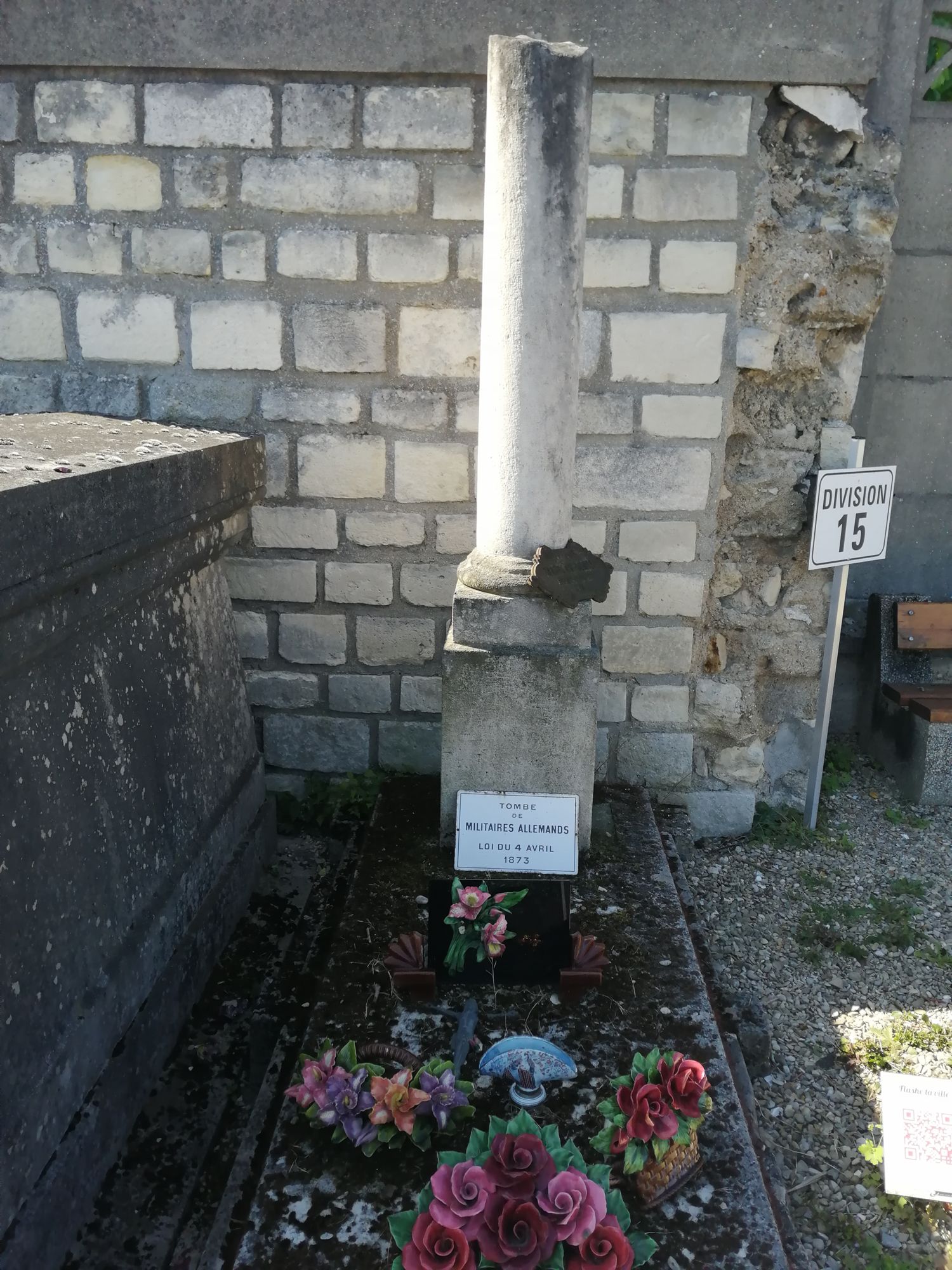 Une plaque émaillée posée sur la tombe et une autre réglementaire, en fonte, rappellent la loi de 1873 qui engage l'Etat français à la conservation des tombes des soldats morts pendant la guerre de 1870-1871.