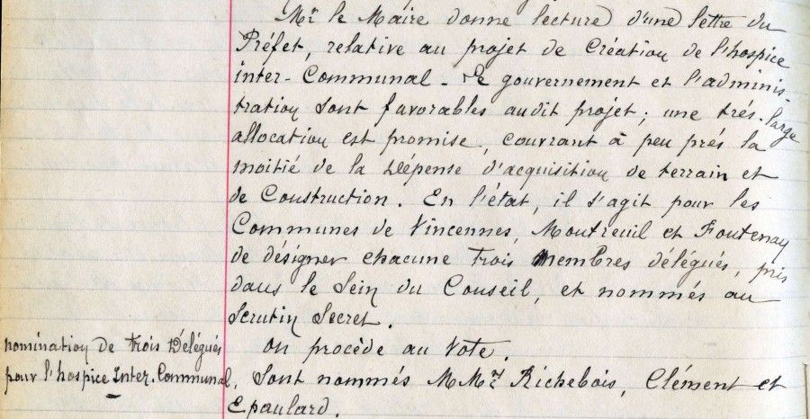 Pour mettre fin à ce déplorable état de chose, la préfecture de la Seine élabore un projet afin de créer à Fontenay-sous-Bois un hospice intercommunal où seront reçus les infirmes et vieillards de Fontenay, Vincennes et Montreuil.
