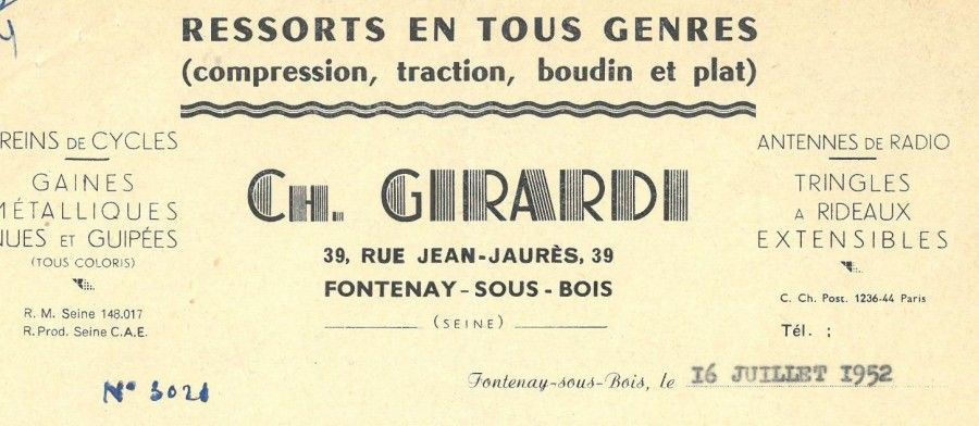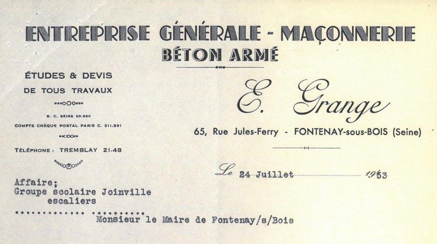 Entête entreprise générale maçonnerie-béton armé E. Grange, 65 rue Jules-Ferry, 1953