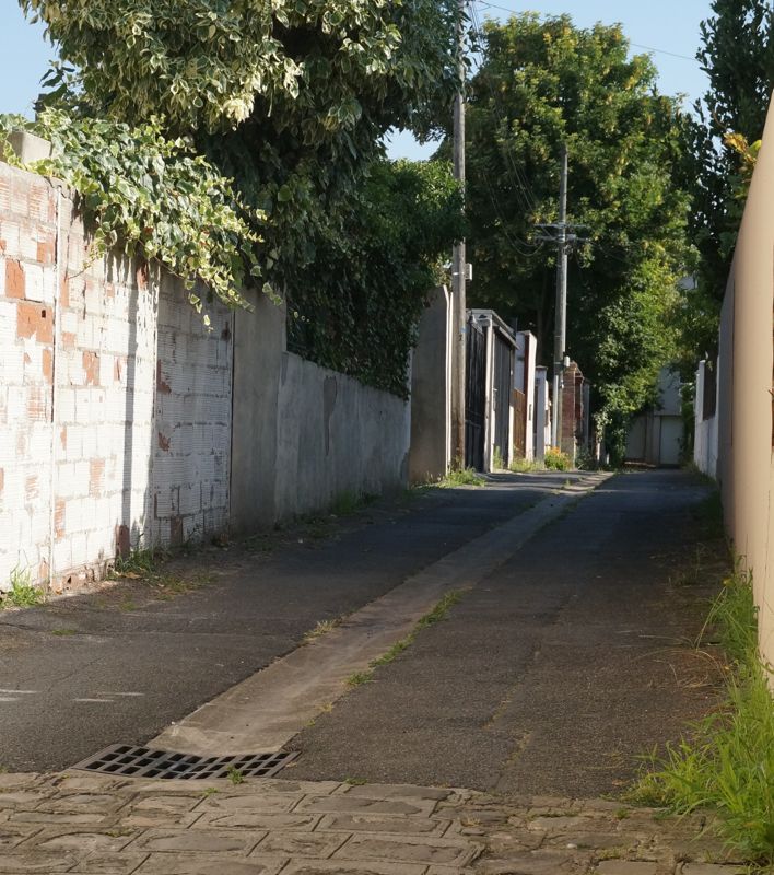 Voie privée en cul de sac. Exemple de lotissement d'une parcelle particulièrement étroite; maisons adossées à la limite séparative. Sol en graviers facilitant l'écoulement des eaux pluviales.