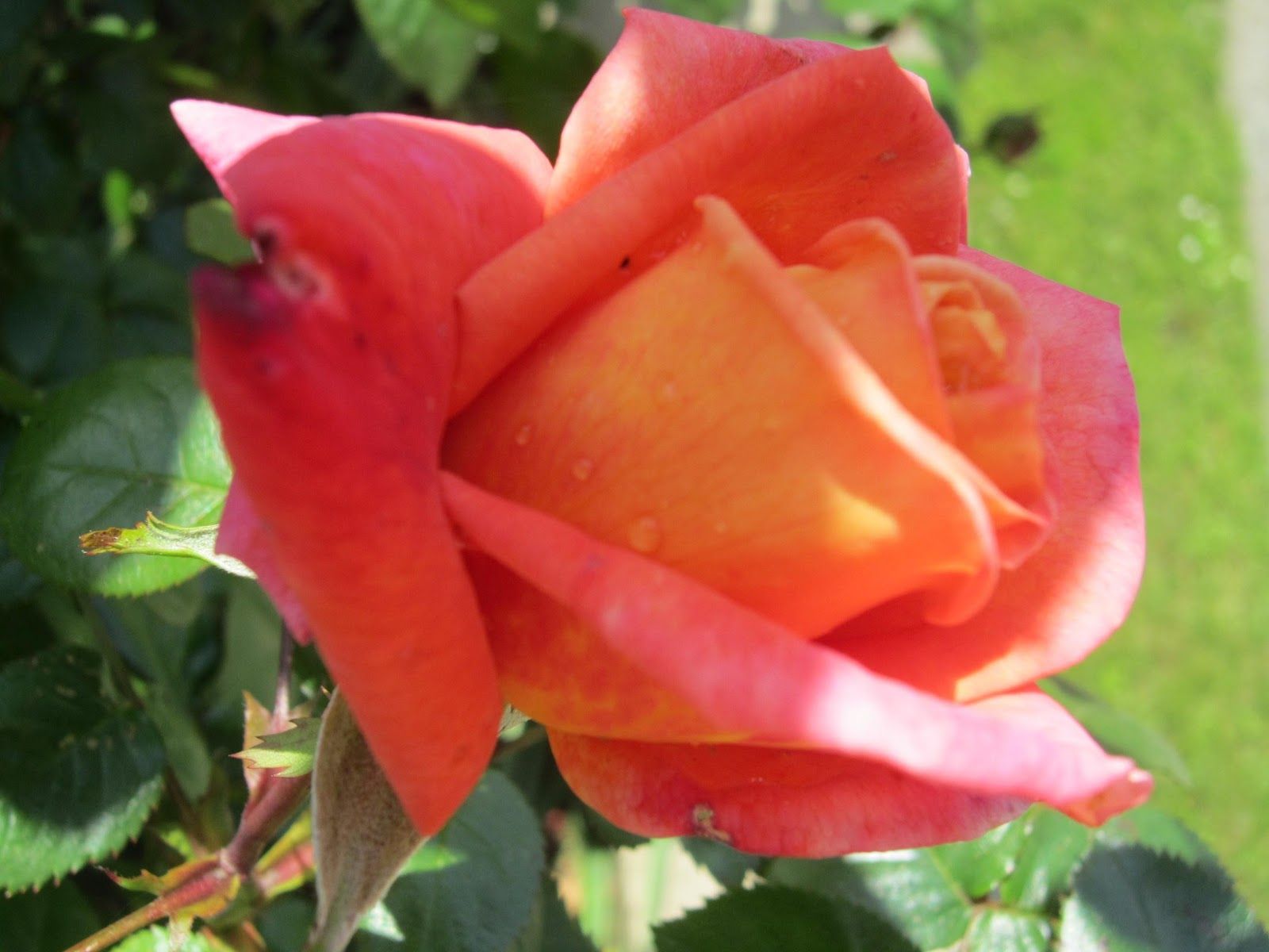 Elle change de couleur. Elle nait, bouton rouge, puis s’entrouvre et libère de pâles touches roses et or.
