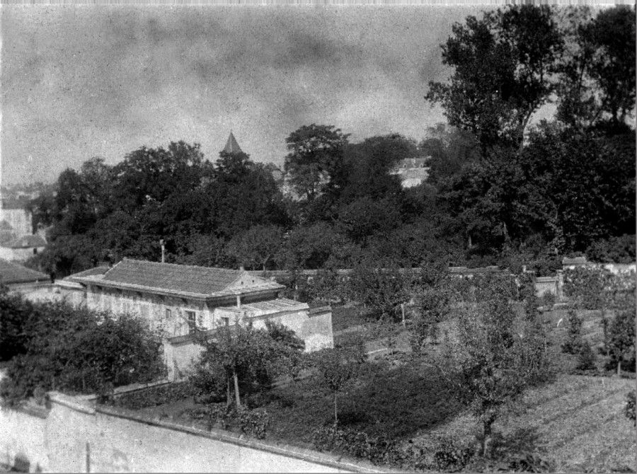 - Photographie du potager des Franciscains, rue Louis-Xavier-de-Ricard. Le bâtiment au 1er plan à gauche fût un temps le local des scouts. Au fond la bâtiment de la pouponnière?. Photo prise de chez Georges Baehr, au 14 rue Louis-Xavier-de-Ricard. Sans date.