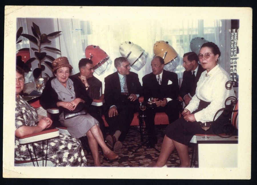 10 personnes dont M. et Mme Jules Baehr à gauche, Georges Baehr de l'autre côté du guichet, sa soeur Renée à droite et son frère Jean, au fond assis derrière le guichet.