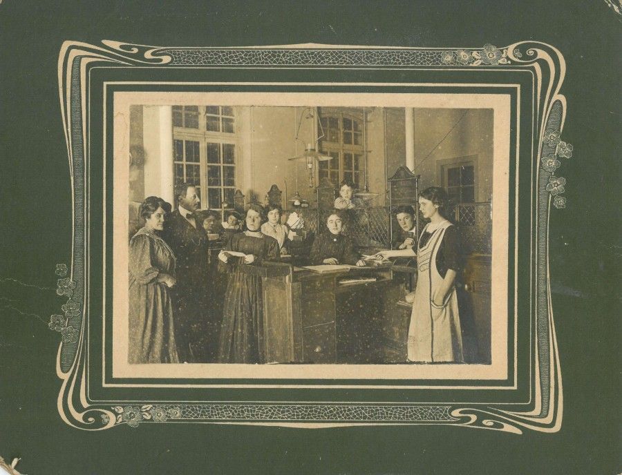 - Photographie prise à l'intérieur de la Poste de Fontenay-sous-Bois, boulevard des Ecoles (actuel boulevard André-Bassée), salle du télégraphe, M. et Mme Jules Baehr et 4 employées, vers 1909