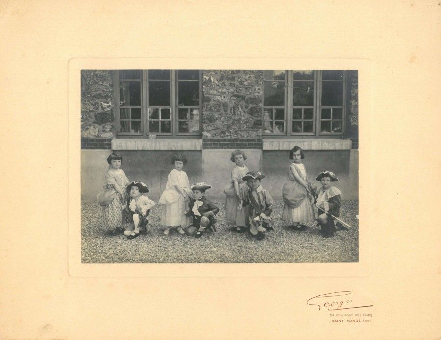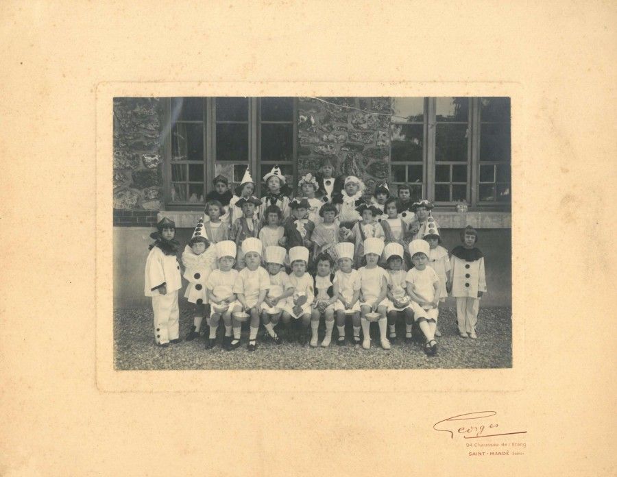 - Photographie d’un groupe d’élèves de maternelle, déguisés, dans la cour de récréation de l’école Mot au 2ème rang, 3ème en partant de la gauche, Janine Baehr, née en 1921, mère de Jean-Marc Dauvergne. Vers 1926