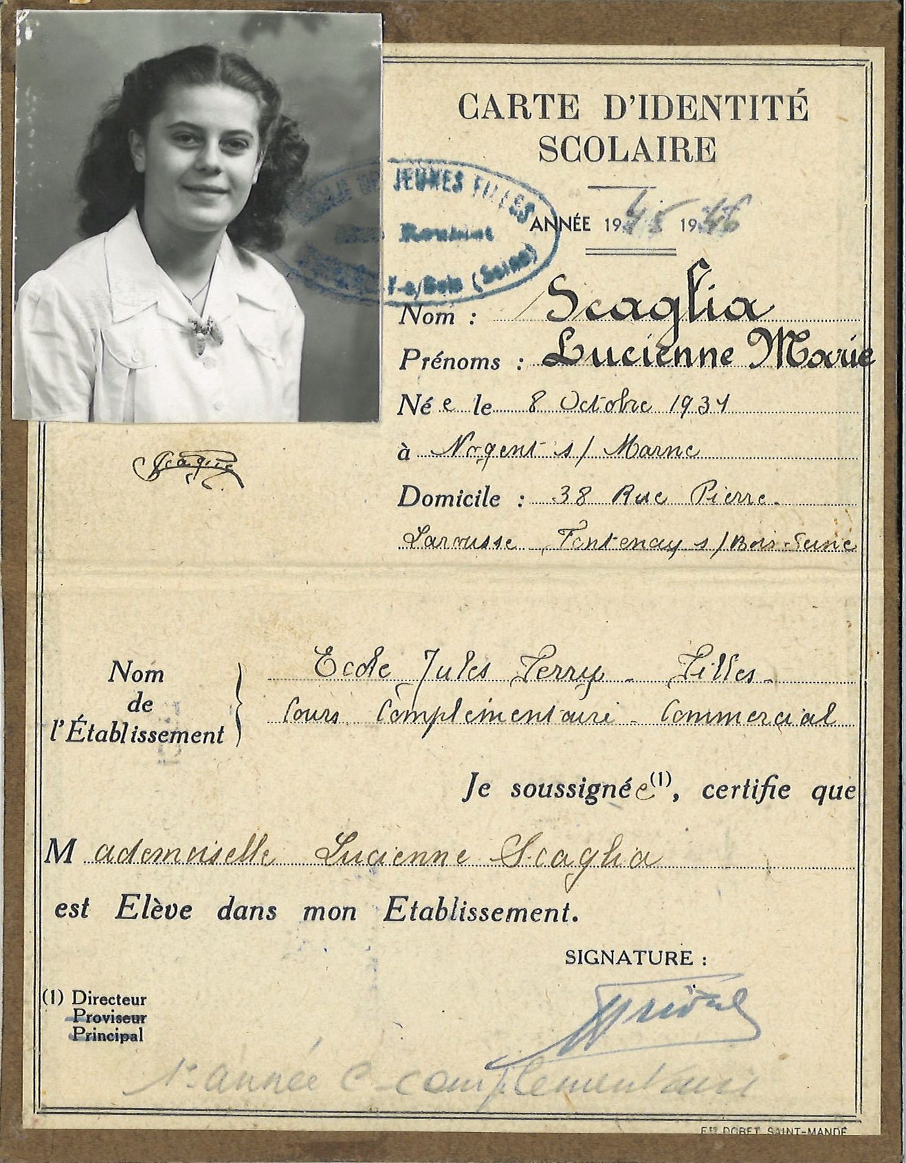 - carte d'identité scolaire de Lucienne Scaglia, Cours Complémentaire Commercial (CCC) à Jules-Ferry, années 1945-1946 2 Z 109