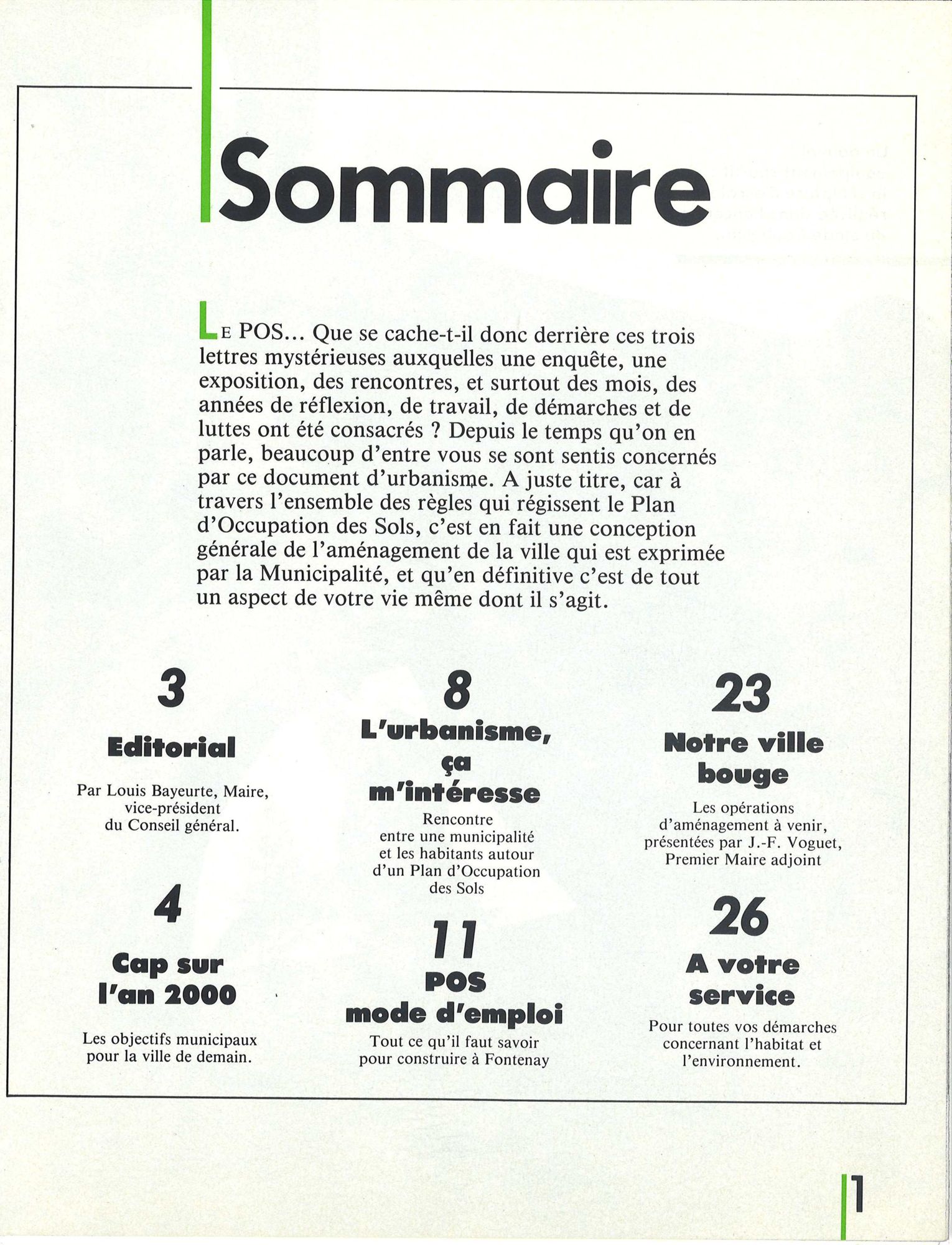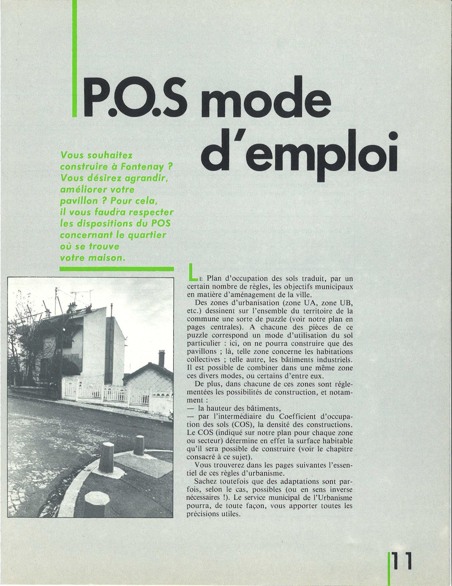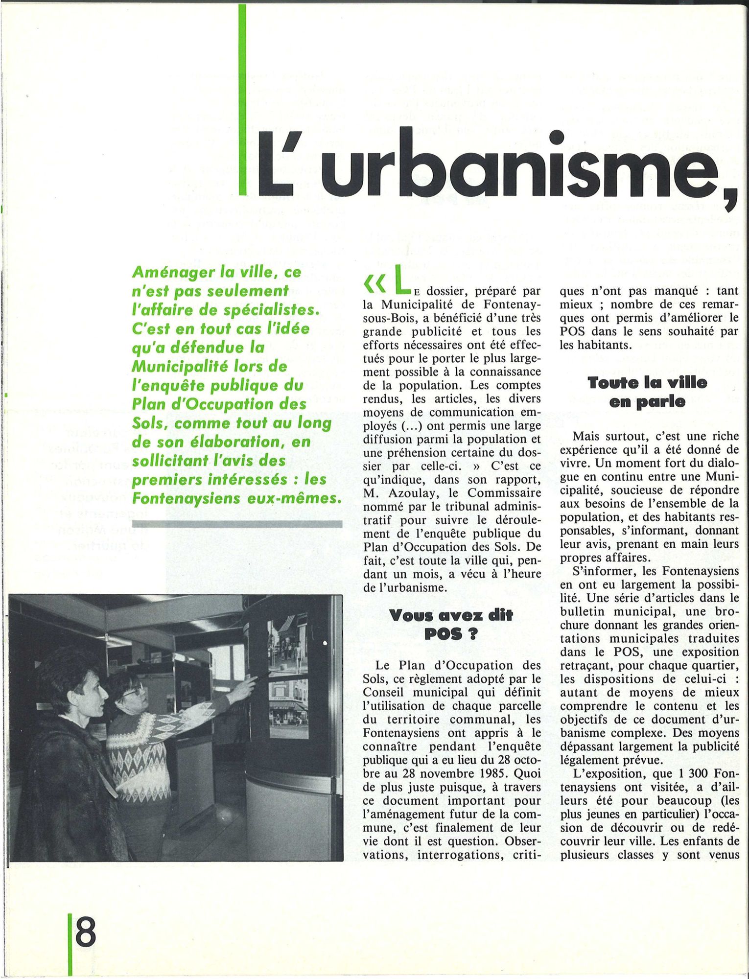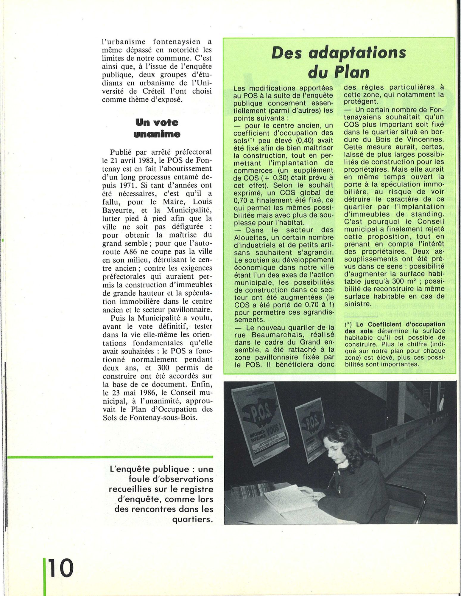 Dans la cadre d'une enquête publique qui a lieu en octobre et novembre 1985, la Ville de Fontenay-sous-Bois publie une plaquette de présentation du Plan d' Occupation des Sols (P.O.S.) en 1985.
